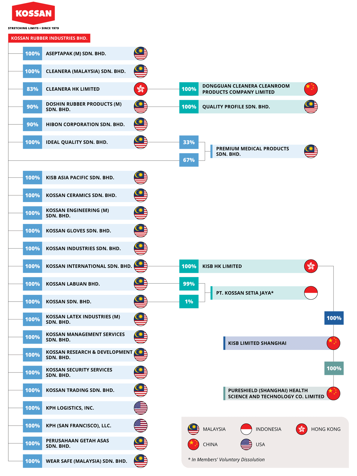 The diagram below displays the company structure of KOSSAN Group and how the subsidiaries within the Group portfolio relate to one another.